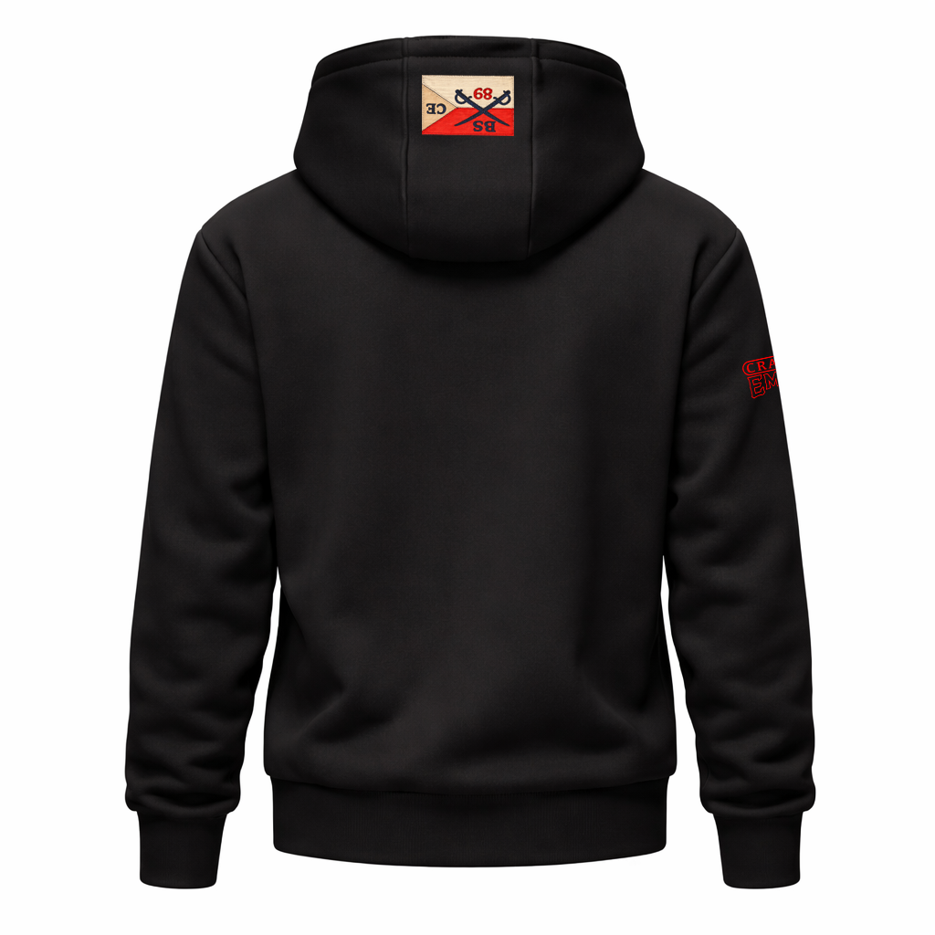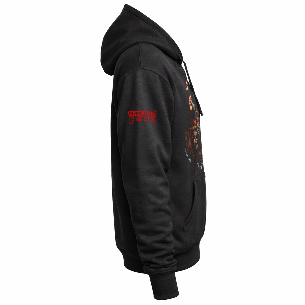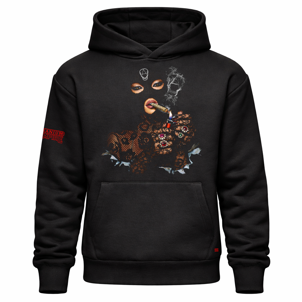 Heavyweight black hoodie featuring a high-impact front graphic of a masked muse mid-flame — lace textures, jewel-stacked rings, and smoke forming a skull silhouette. The sleeve carries the CRANIUM EMPIRE stamp of approval in red.