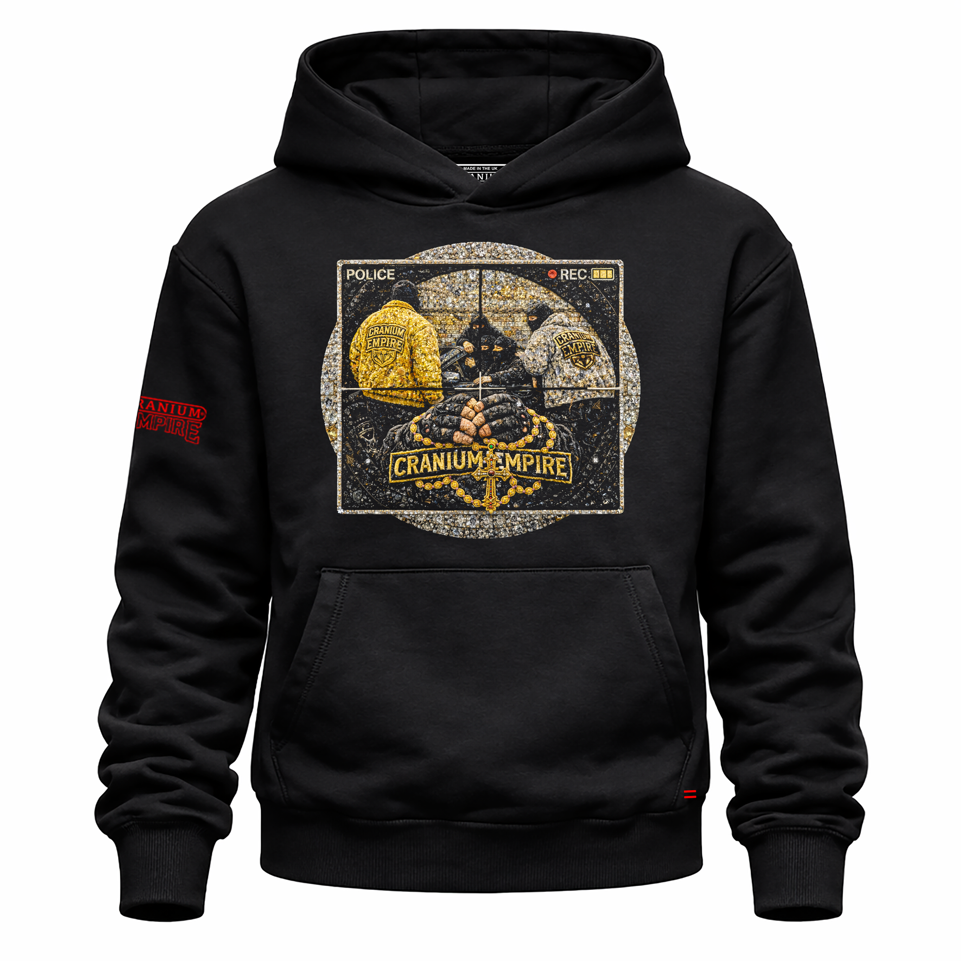 Surveillance Hoodie – Black Step into a statement piece that commands attention. This heavyweight hoodie merges bold visual storytelling with premium comfort, featuring an intricate "REC" frame graphic layered with diamond-studded details, gold and silver textures, and the iconic CRANIUM EMPIRE crest. The cinematic camera overlay and circular backdrop create a striking focal point—a frozen moment of power and presence. Crafted from a premium cotton blend with brushed fleece lining, it delivers both durability and warmth. The relaxed structured fit, three-panel hood, and front pouch pocket ensure functionality meets edge. Finished with signature red sleeve branding and minimalist hem accents, this hoodie transforms everyday wear into wearable art. Framed like evidence. Worn like armour.
