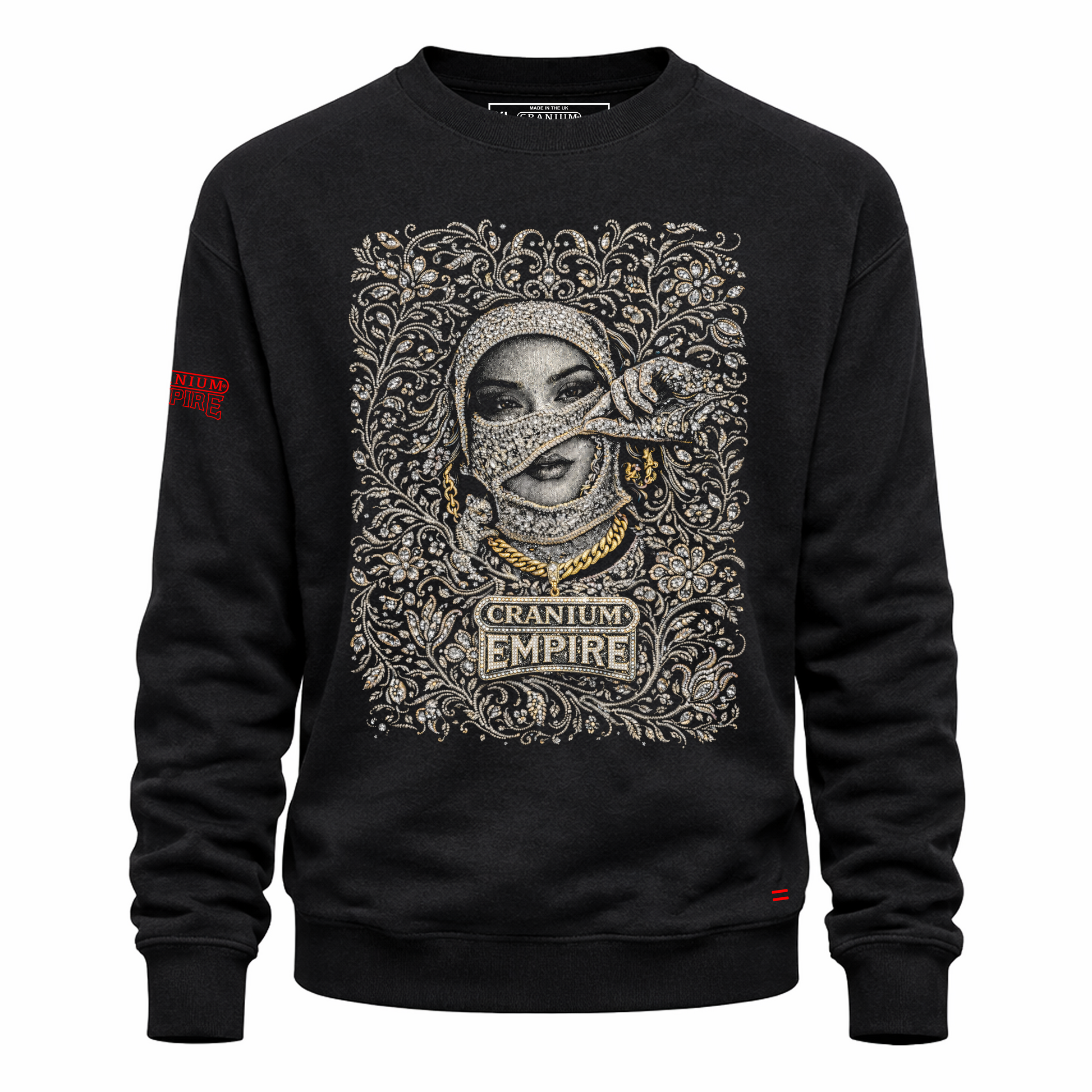 Command the room in the OPULENCE CREWNECK – BLACK, where luxury and edge converge. This heavyweight piece showcases an ornate diamond-encrusted muse surrounded by baroque detailing, layered gemstones, and intricate floral scrollwork, anchored by the bold CRANIUM EMPIRE pendant at centre. The rich embellishment contrasts dramatically against the deep black base, creating undeniable presence and authority. Crafted from premium cotton blend with a soft brushed interior, it delivers both comfort and impact. The relaxed structured fit, ribbed finishing, and signature red sleeve branding complete a statement piece that blends heritage craftsmanship with contemporary street style. Wear it as a declaration.