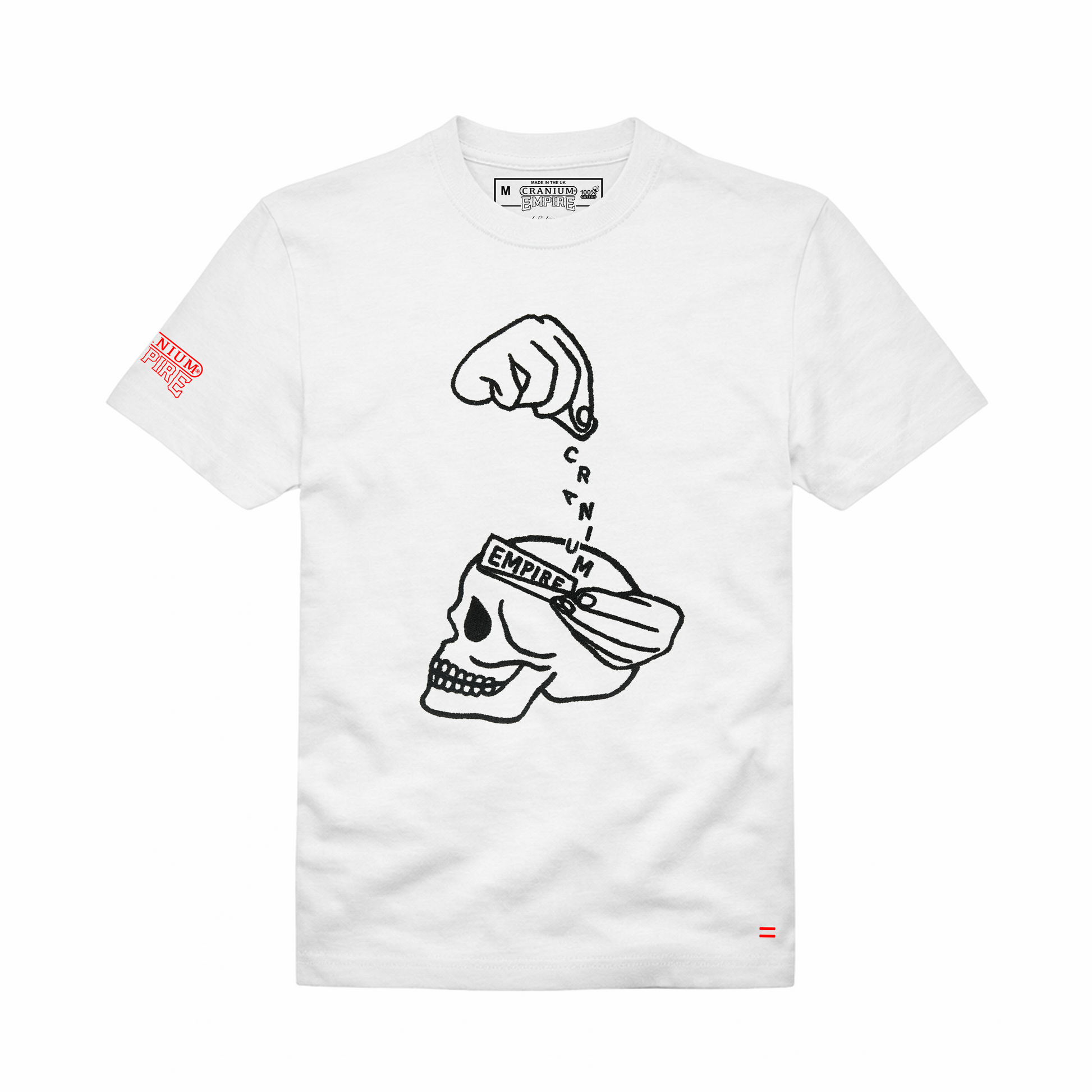 Premium white tee built on a bold concept: a hand-drawn skull graphic releases "CRANIUM" into the mind, stamped with EMPIRE branding. Minimal linework, maximum impact. Crafted from heavyweight cotton with a structured street fit, high-definition front print, and signature red sleeve branding. This isn't just apparel—it's a statement piece that speaks to those who think differently. Sharp. Direct. Intentional.