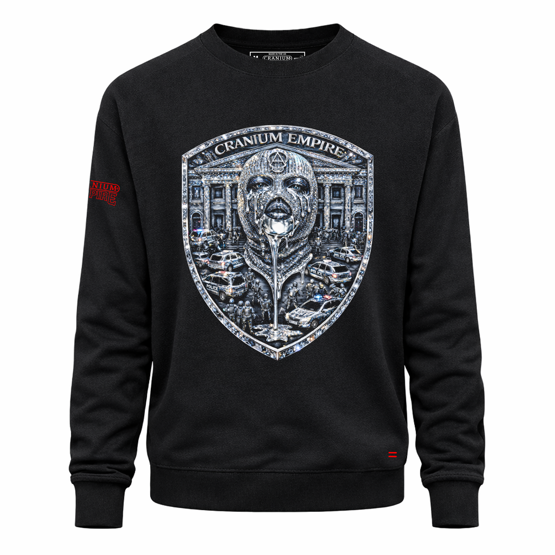 Siege Crest Crewneck – Black Power under pressure. This heavyweight black crewneck channels institutional authority through striking monochrome artwork: a diamond-armoured muse framed within a monumental crest, surrounded by columns, flashing lights, and controlled chaos. Iced tears and molten chrome details cut through the design with cold metallic precision, creating depth and dominance against the base. Premium heavyweight cotton blend with soft brushed interior ensures comfort without compromise. Sharp, uncompromising aesthetic finished with signature red sleeve branding and subtle hem accent—a coat of arms for those who stand firm when the world closes in.