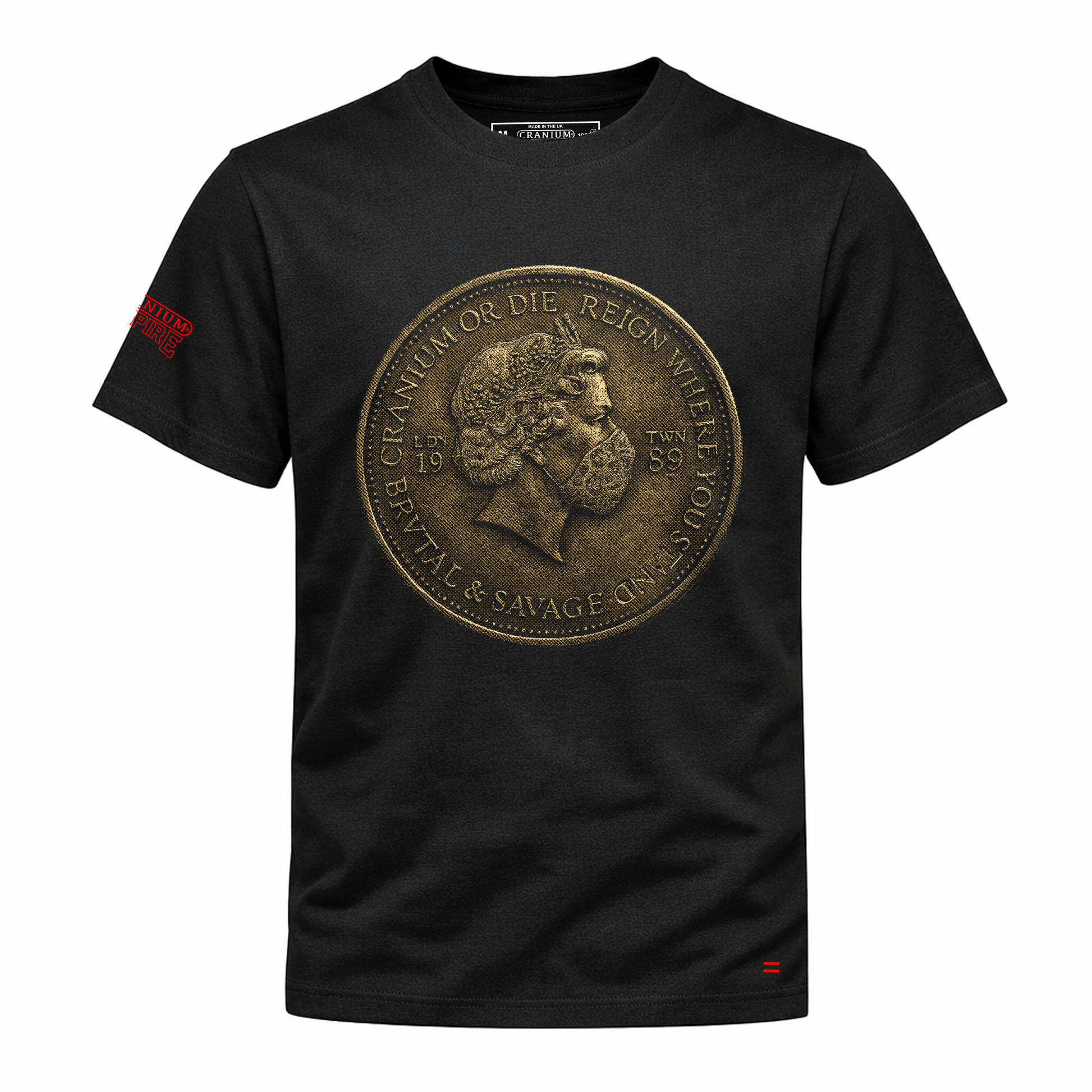 Command authority with the Imperial Coin Tee in black. This heavyweight cotton essential features a striking gold-toned coin graphic emblazoned with CRANIUM OR DIE and REIGN WHERE YOU STAND, centred by a classical profile and intricate engraved detailing. The aged gold finish creates a timeless, sovereign contrast against the deep black base—channelling vintage prestige with a modern empire mindset. Structured for street credibility with a ribbed crew neckline, high-definition front print, and signature red sleeve branding. Own the aesthetic of a relic from a future dynasty.Finished with signature red sleeve branding and subtle hem accent for understated identity.